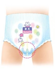 Indicator in Merries- three special lines- will let you know that the baby has peed. The lines in the center of the pull-up will become blue when you need to change the diaper.