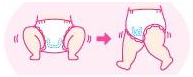 Pull-ups Merries gently and carefully hug baby's legs. The absorbing layer of the pull-ups transforms and absorbs from all the sides. Merries adjust to the body of a baby and don't prevent him from his active lifestyle. That is very important in such age.