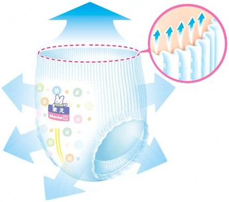 The whole surface of Merries allows evaporation. Thanks to the «breathing» surface, baby's behind will always stay dry. Special air channels of Merries pull-ups spread all the evaporation over the entire surface.